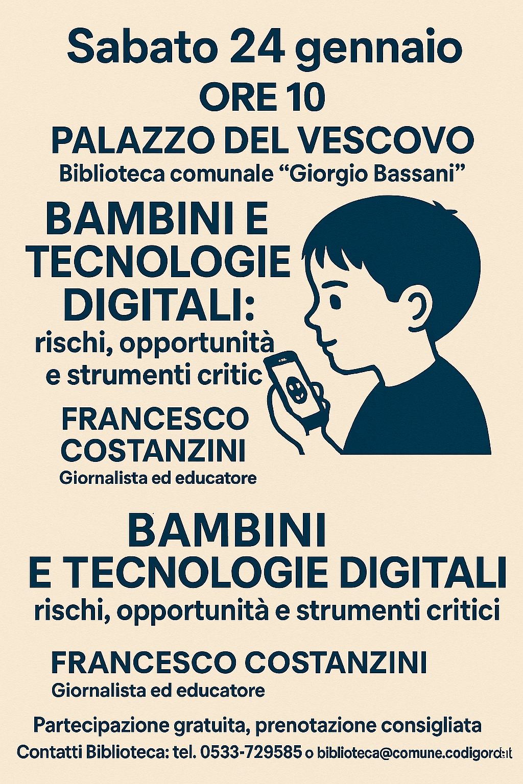 La partecipazione è gratuita, ma è consigliata la prenotazione, contattando la biblioteca ai seguenti recapiti: tel. 0533-729585 o biblioteca@comune.codigoro.fe.it