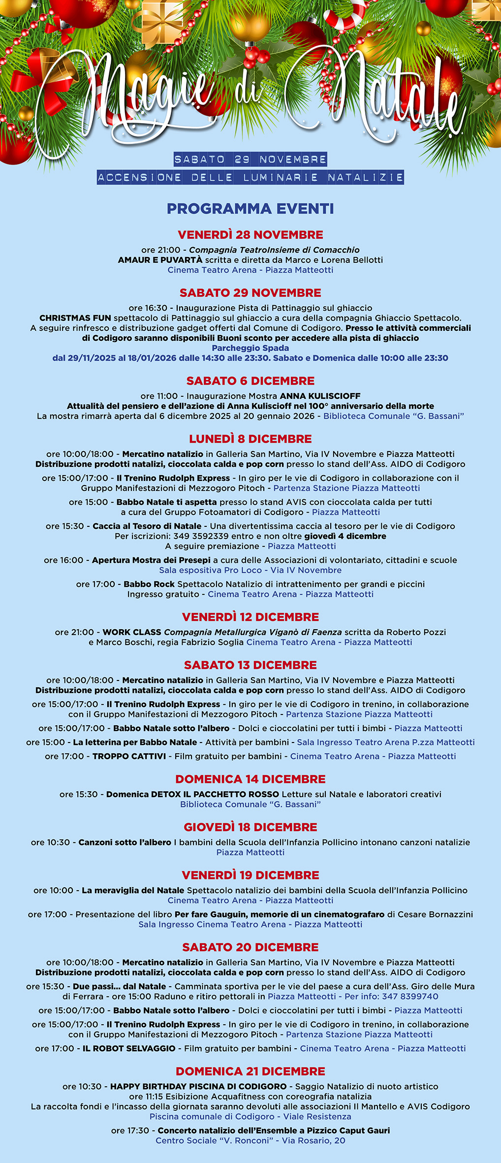 Sabato 29 novembre, largo al momento più atteso: l’inaugurazione, alle 16.30, della pista di pattinaggio, accompagnata dallo spettacolo Christmas Fun, con rinfresco, gadget caldi offerti dal Comune di Codigoro e gadget per tutti.